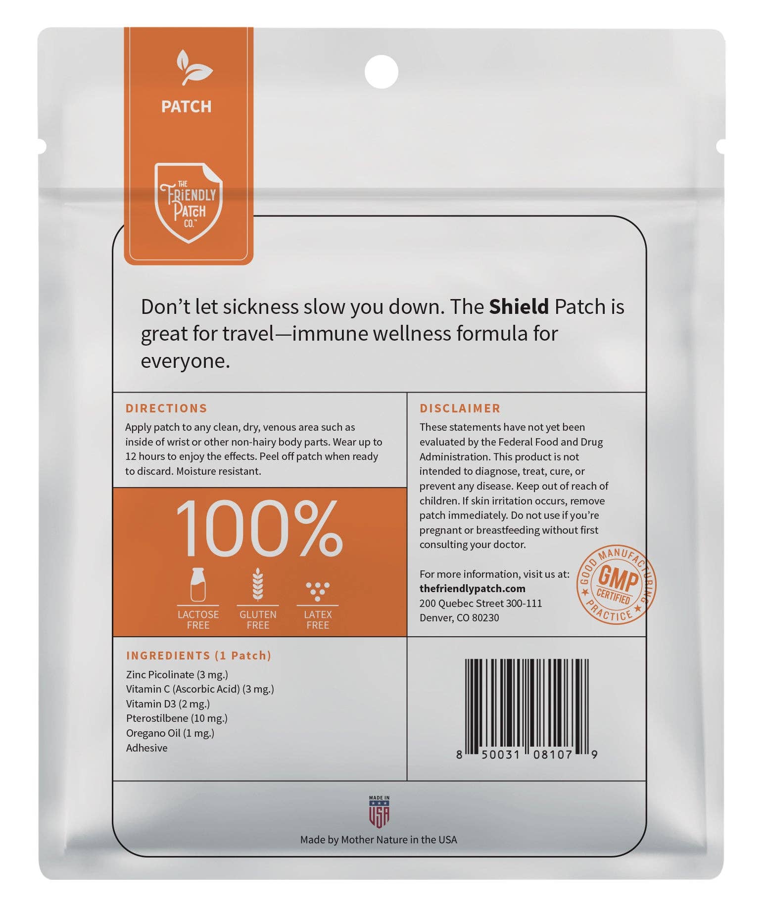 Benefits of Shield Wellness Patch The Shield Patch is a unique product that combines a blend of natural ingredients, including Zinc, vitamin C and vitamin D3, Pterostilbene, and Oregano Oil, to provide various benefits for Wellness. These Plant-Powered patches are made in the USA without carriers, no fillers, no artificial flavors, no GMO’s.